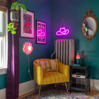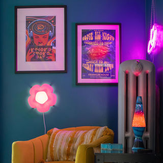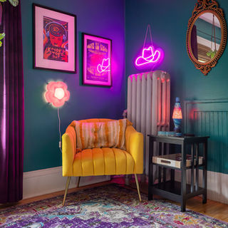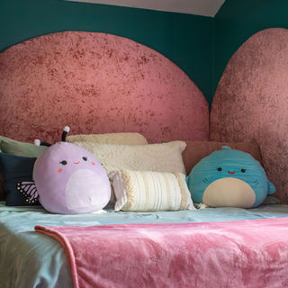 We turned this room into a 420-friendly cuddle puddle paradise with plush custom headboards, a trippy psychedelic mural, and a bold jewel-tone palette that makes the whole space pop with cozy, colorful vibes.